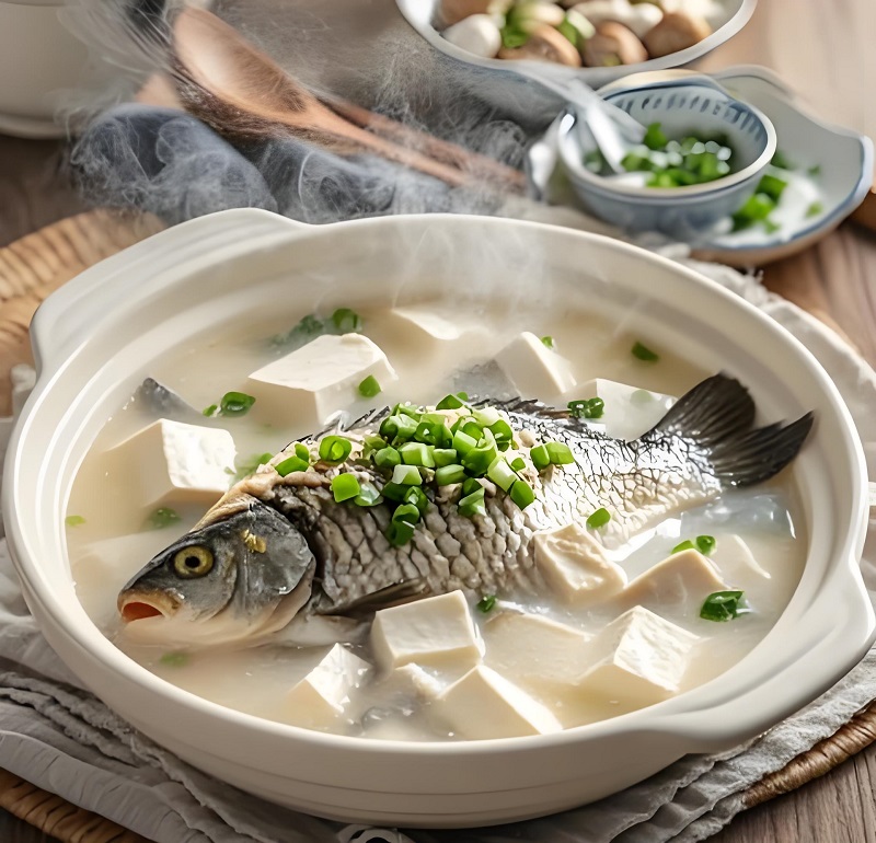 鲫鱼豆腐汤:经典滋补汤品,汤色奶白,鲜香浓郁,适合产妇和体弱者。
