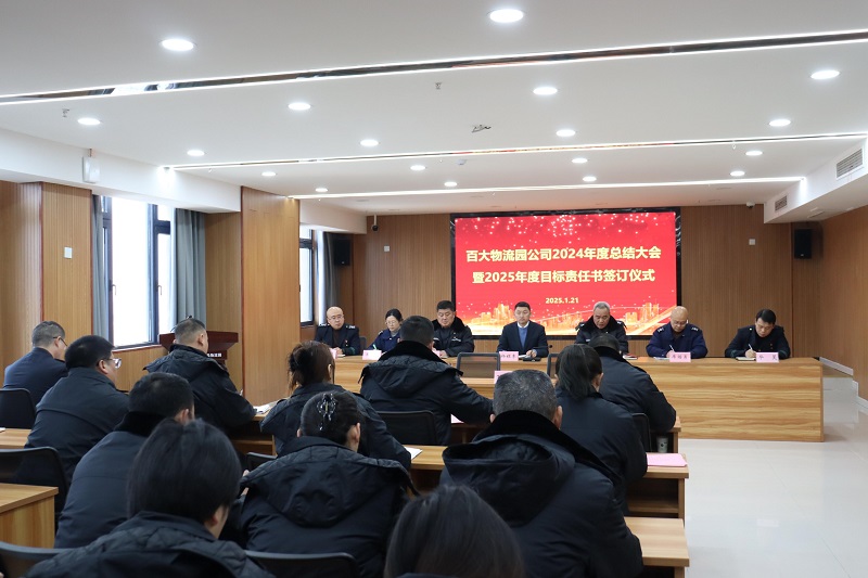 2025年1月21日下午,百大物流园2024年度总结大会暨2025年度目标责任书签订仪式在六楼会议室召开,公司经营层、中层管理人员及员工代表共60人参加会议。会议由公司党委副书记、副总经理朱守正主持。