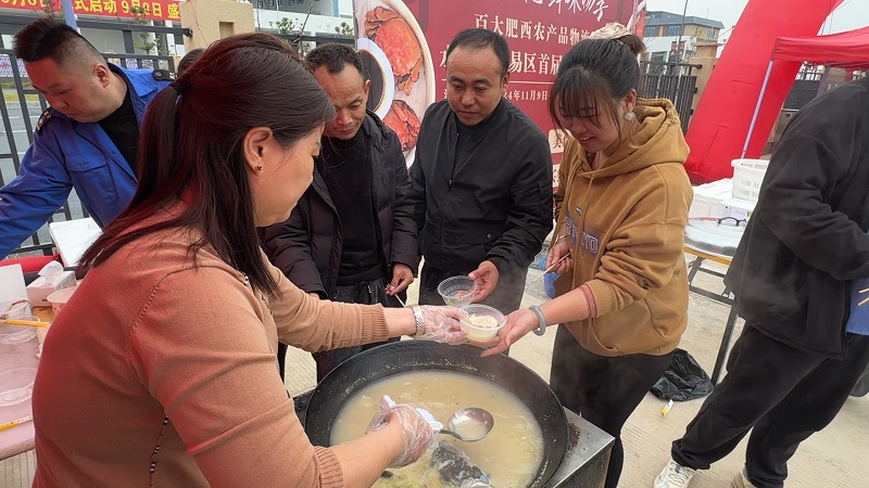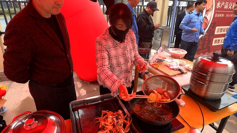 活动现场,各式规格黄满膏肥的大闸蟹成为了绝对的亮点,吸引了众多消费者的目光。鲜活鲍鱼、肥美黄鱼、饱满花甲、乳山生蚝以及花亭湖有机鱼等各类水产品也纷纷亮相,为消费者提供了多元化的选择。美食品鉴区更是热闹非凡,现场烹饪香气四溢,吸引了大量消费者驻足品尝。各展台前人头攒动,热闹非凡,整个活动现场洋溢着欢乐祥和的喜庆氛围。