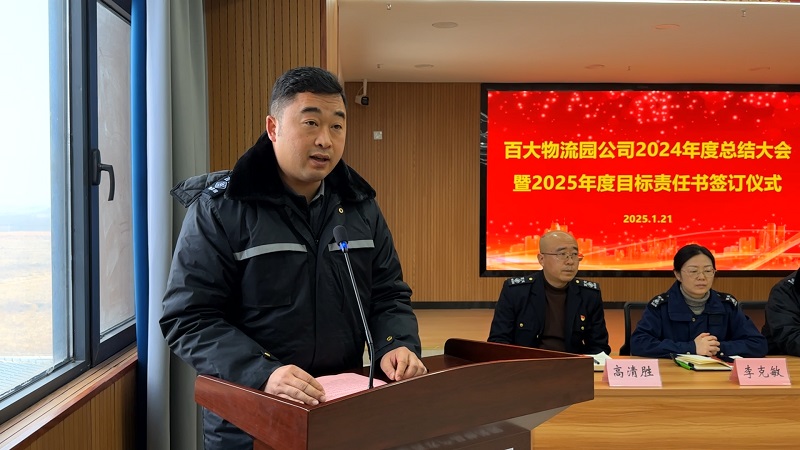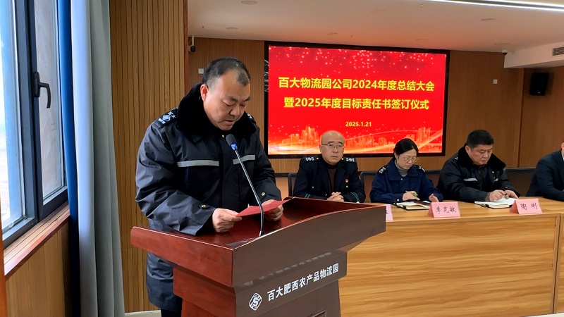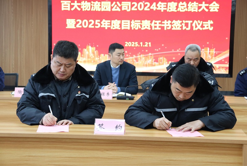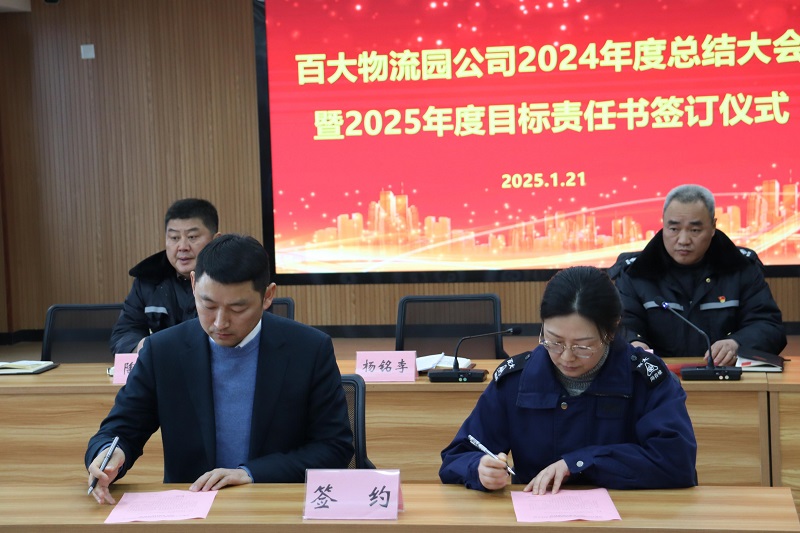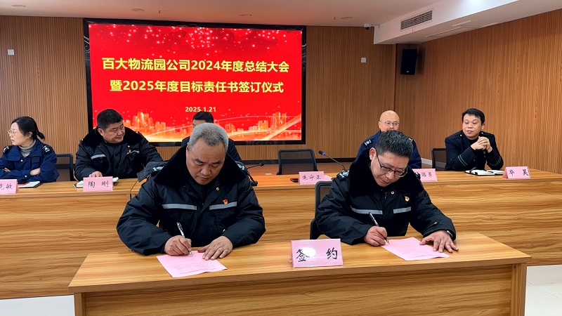 2025年1月21日下午,百大物流园2024年度总结大会暨2025年度目标责任书签订仪式在六楼会议室召开,公司经营层、中层管理人员及员工代表共60人参加会议。会议由公司党委副书记、副总经理朱守正主持。