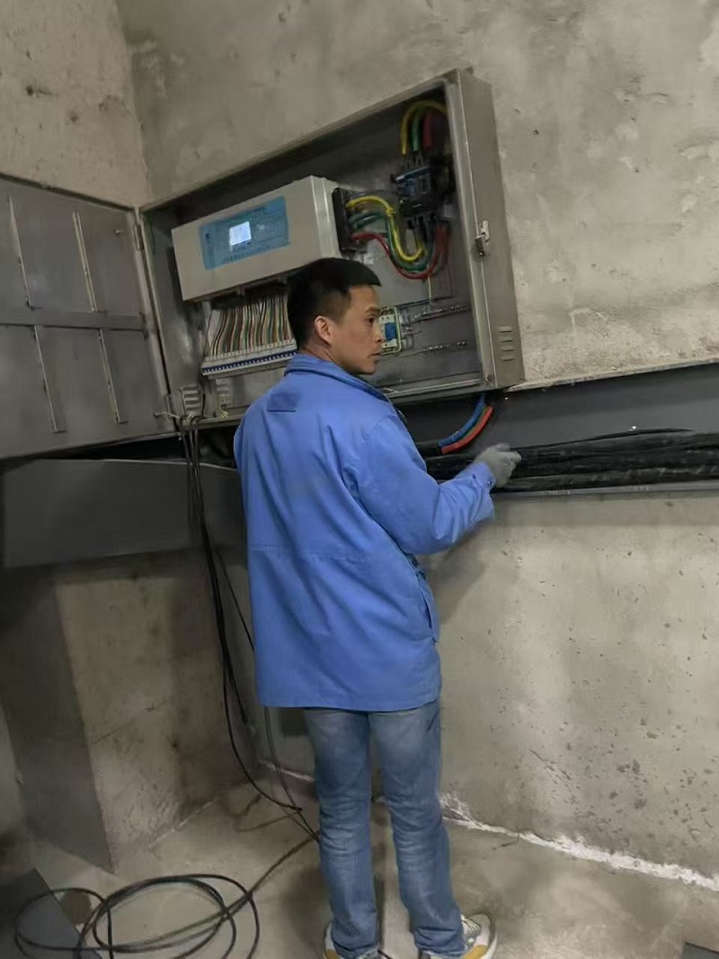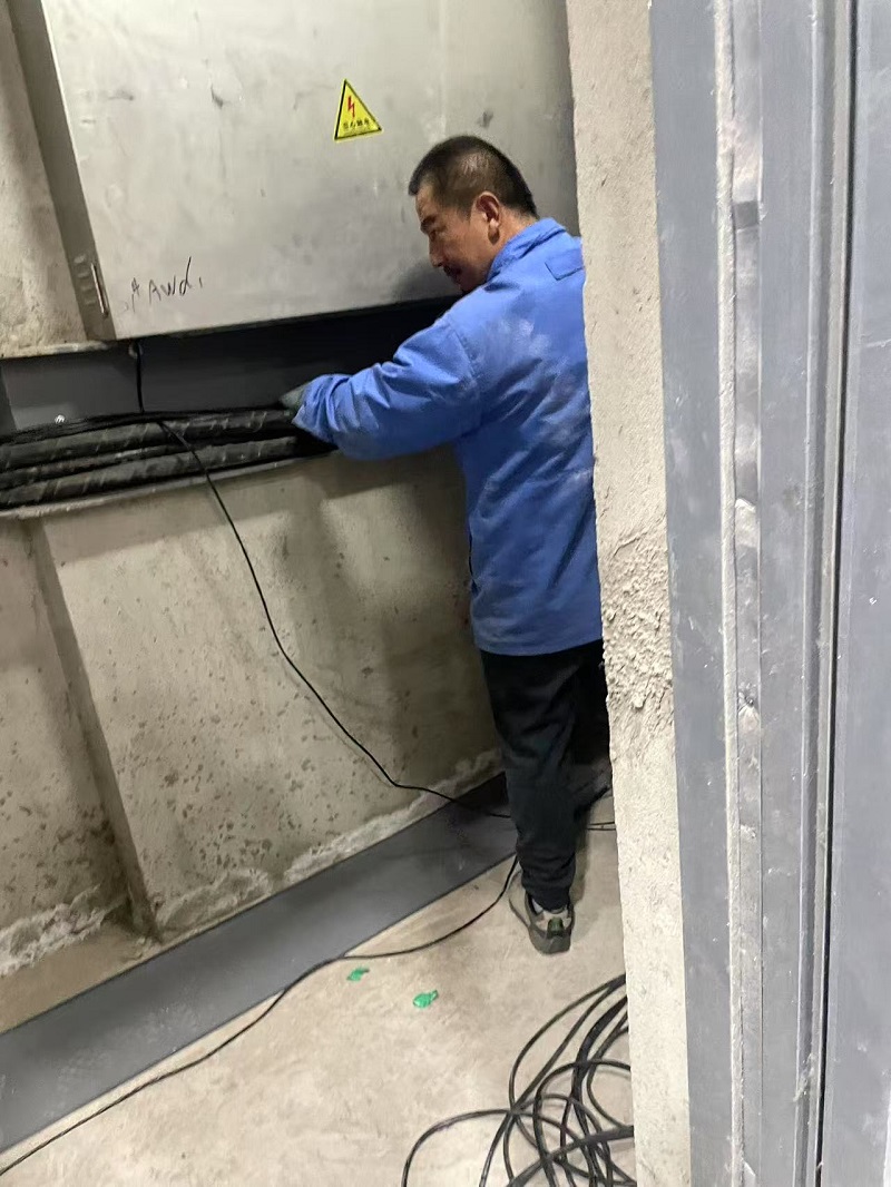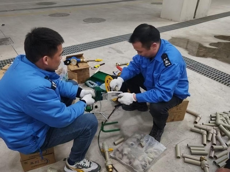 2.水电线路铺设,争分夺秒。施工人员克服工期紧张、施工难度大等困难,采用“模块化预制+分段热熔”工艺,将常规需要数天的PPR管施工时间大幅压缩,高效完成了数十条给水管网的铺设任务。为满足商户个性化用电需求,部门员工在十余米高的桥架上架设电缆,夜间作业时顶闪烁如“空中星河”。他们精益求精,确保用电系统与智能配电柜数据联动,为商户提供了稳定可靠的电力保障。