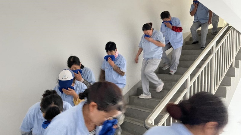有序疏散:在疏散引导员的指挥下,全体人员按照预定逃生路线,弯腰低姿、捂住口鼻,快速有序撤离至安全集合点。医疗救护组对模拟受伤人员进行了紧急救治,展现了高效的应急协作能力。