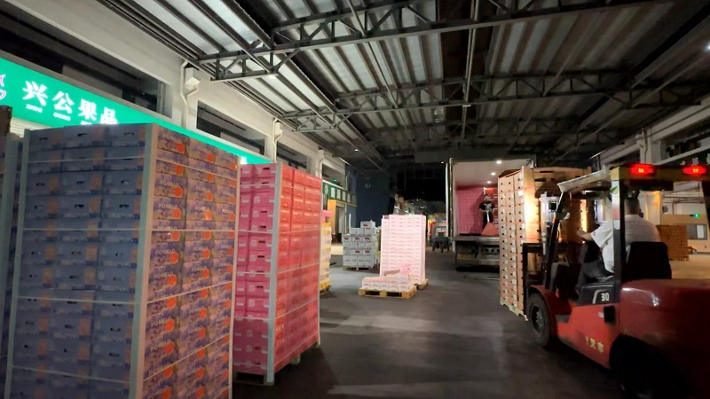 随着国庆、中秋“双节”临近,百大物流园呈现出一片热闹繁忙景象。凌晨三点的物流园,满载着新鲜农产品的货车络绎不绝穿梭其中,工人们有条不紊地装卸着每一件货物,节日市场氛围日益浓厚。近一周交易量达9900吨,交易额达12700万元。